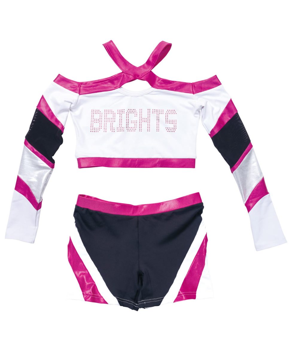 大胆な切り替えの首元とオープンショルダーなデザインが特徴的なデザイン。胸元のロゴにはカラーラインストーンをふんだんに使う代わりに、その他はシンプルにまとめてメリハリを利かせています。パンツのサイドにある深めの切り替えラインは脚長効果も抜群。